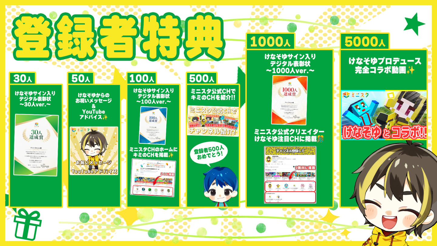 ミニスタは、「動画を作れる子」だけでなく、「自分の表現で、誰かを喜ばせる喜びを知っている子」を育てたいと考えています。 自分の考えや作品が認められる経験は、子供たちの「大きな自信(自己肯定感)」に繋がります。その「小さな成功体験」を積み重ねるために用意したのが、YouTubeチャンネル登録者数の達成特典です。